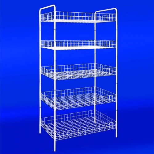 Butikshyllar med 5 stycken hyllplan gjord av förstärkt ståltråd för att öka hållbarhet och kapaciteten, enkel att montera och demontera.