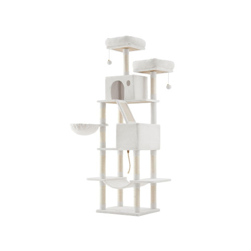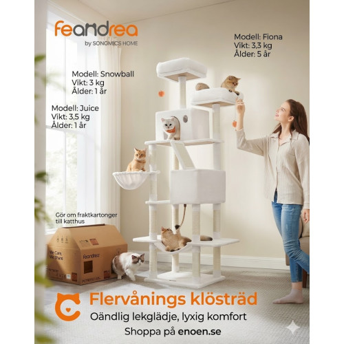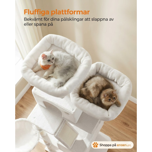 Allt-i-ett-lekplats: Utrustad med 2 välstoppade plattformar, 2 mysiga grottor, 1 fluffig korg, 1 hängmatta och utbytbara plyschbollar. Varje katt hittar sin favoritplats!