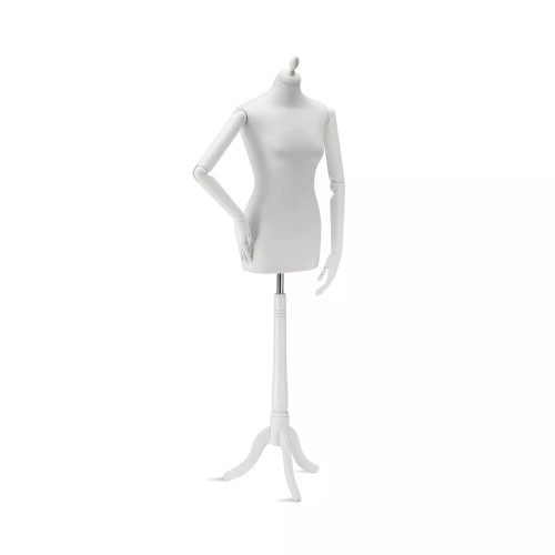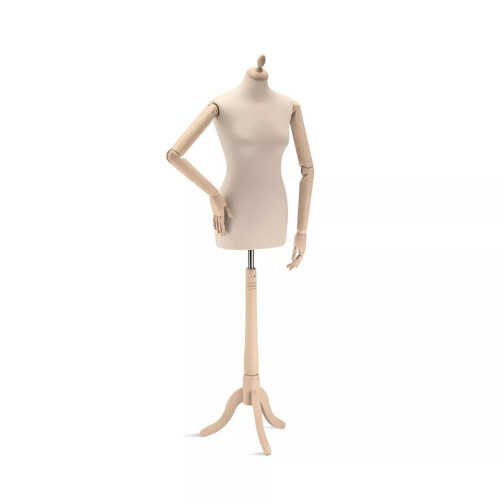 Skapa levande och dynamiska exponeringar med vår premium dambyst. Denna torso är klädd i slitstarkt tyg (välj mellan svart, vit eller beige) och utrustad med fullt ledade armar i trä. Armarna ger dig friheten att styla din skyltdocka precis som du vill. Produkten levereras komplett med ett stabilt trästativ – välj mellan en klassisk trefot eller en modern rund bas. Perfekt för butiksinredning, skrädderi eller mässor.