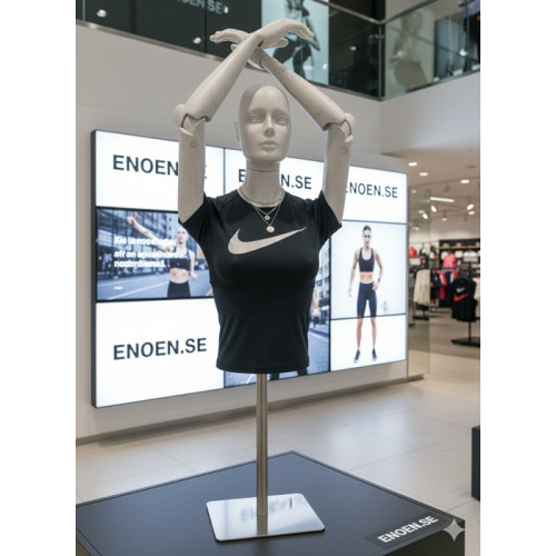 Dynamisk Klädvisning! Denna flexibla, ledade kvinnliga byst är 80 cm hög och tillverkad av slitstarkt, silvergrått polypropenskum – ett lätt och tåligt material. Den justerbara designen gör att du kan skapa verklighetstrogna poser, perfekt för att visa modekläder, arbetskläder, workwear, ridutrustning, sportkläder och som rekvisita i teater, event, de senaste modetrenderna. Inkluderar rektangulär krombas och halskåpa för en elegant finish. Idealisk för butiker, mässor, fotostudios och som rekvisita. Ge dina kläder liv med en flexibel displaylösning!