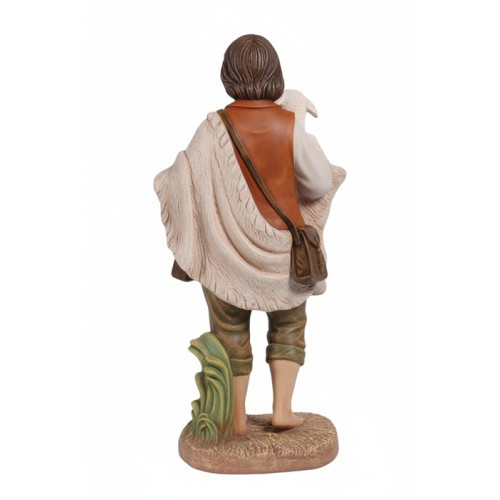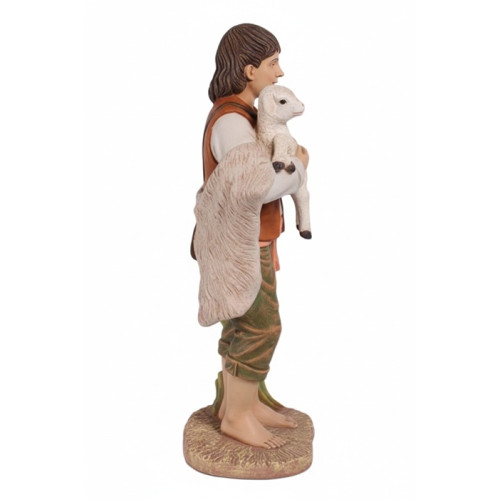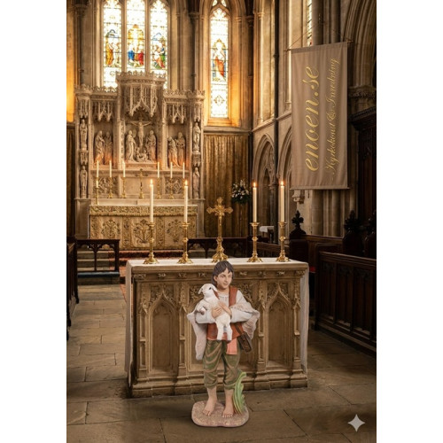 Denna vackra skulptur föreställer en pojke som varsamt håller ett lamm i famnen. Figuren är en central del i den klassiska julkrubban men fungerar lika bra som fristående dekoration i kyrkor och församlingshem.